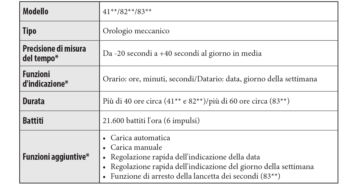 Gli orologi a movimento meccanico possono perdere la precisione a causa della ridotta lubrificazione o dell’usura delle loro parti. Si raccomanda pertanto di richiederne lo smontaggio e la pulizia (revisione) ogni 2 o 3 anni (servizio a pagamento). Potrebbe tuttavia non essere possibile, anche intervenendo con riparazioni, ripristinarne le prestazioni iniziali da una condizione prolungata di deterioramento.