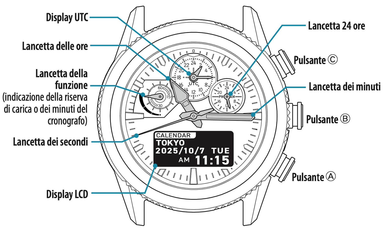 Le lancette e l'indicatore del display a cristalli liquidi indicano l'ora e altre informazioni. |