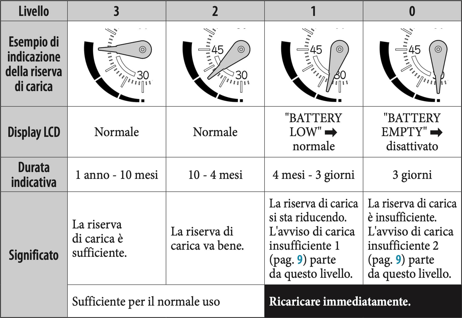 La lancetta di indicazione della riserva di carica indica il livello di riserva di carica.