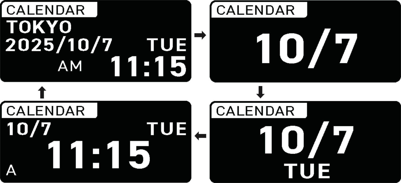 È possibile cambiare l'indicazione sul display LCD quando è impostata la modalità CALENDAR (ora e calendario) o WORLD TIME (ora mondiale).