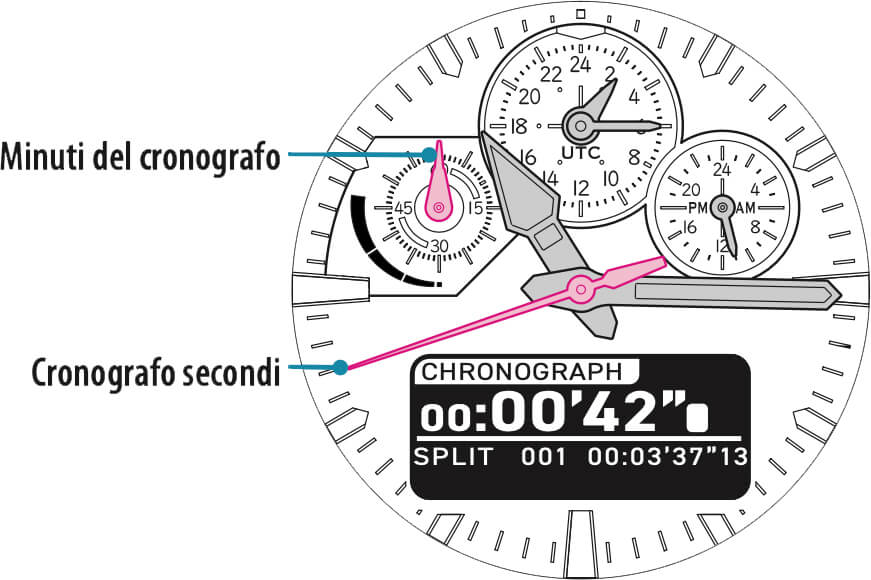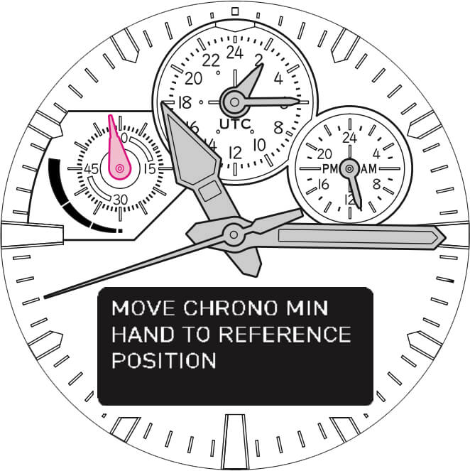 Una volta impostata la prima cifra dei secondi, compare "SETTING COMPLETE" e la regolazione è terminata. Le lancette tornano all'orario corrente. L'indicazione UTC riparte per mostrare l'orario UTC.