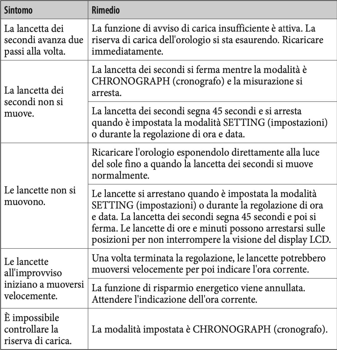 Se l'orologio è stato conservato in un luogo buio per un po' di tempo e non riesce a produrre energia, le lancette si fermano e il display LCD si spegne automaticamente per risparmiare energia.