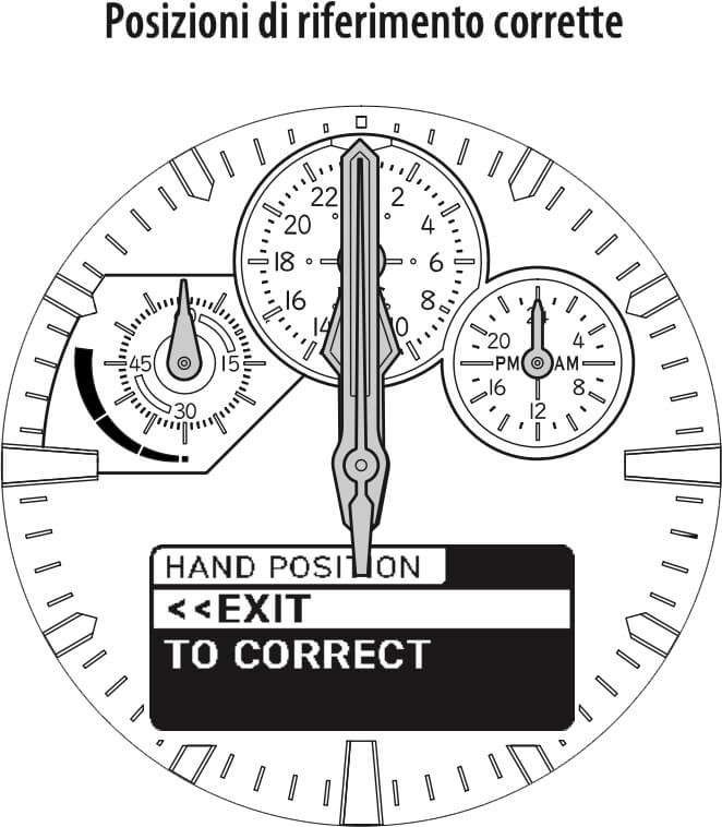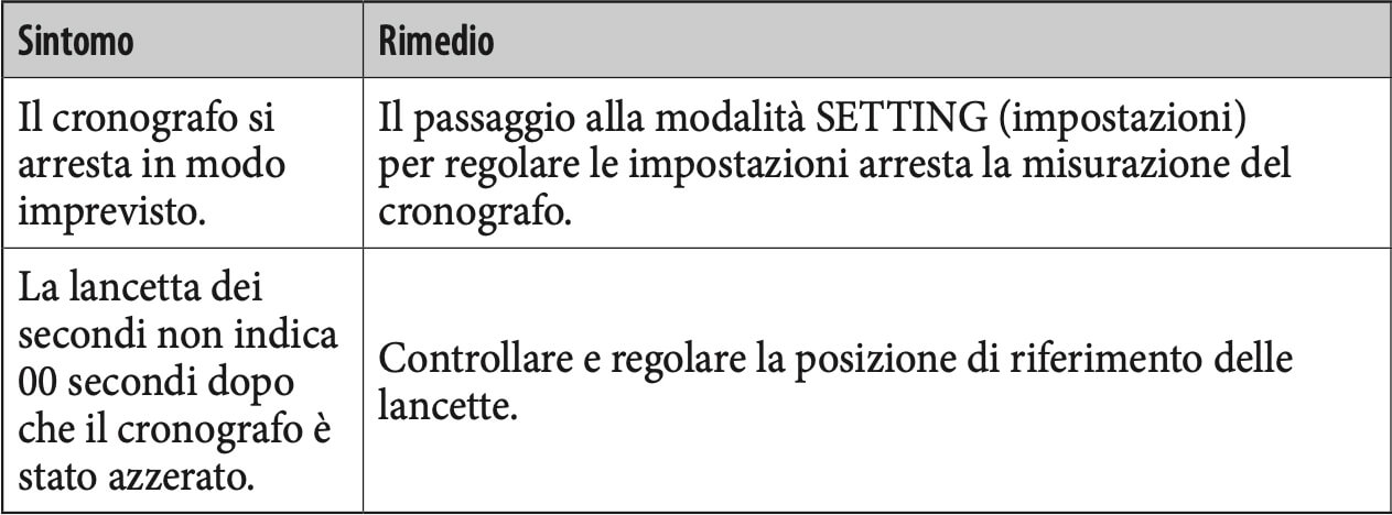 Controllare se la posizione di riferimento è corretta quando le lancette e il display LCD indicano orari diversi in modalità CALENDAR (ora e calendario) o la lancetta dei secondi non indica 00 secondi dopo che il cronografo è stato azzerato.